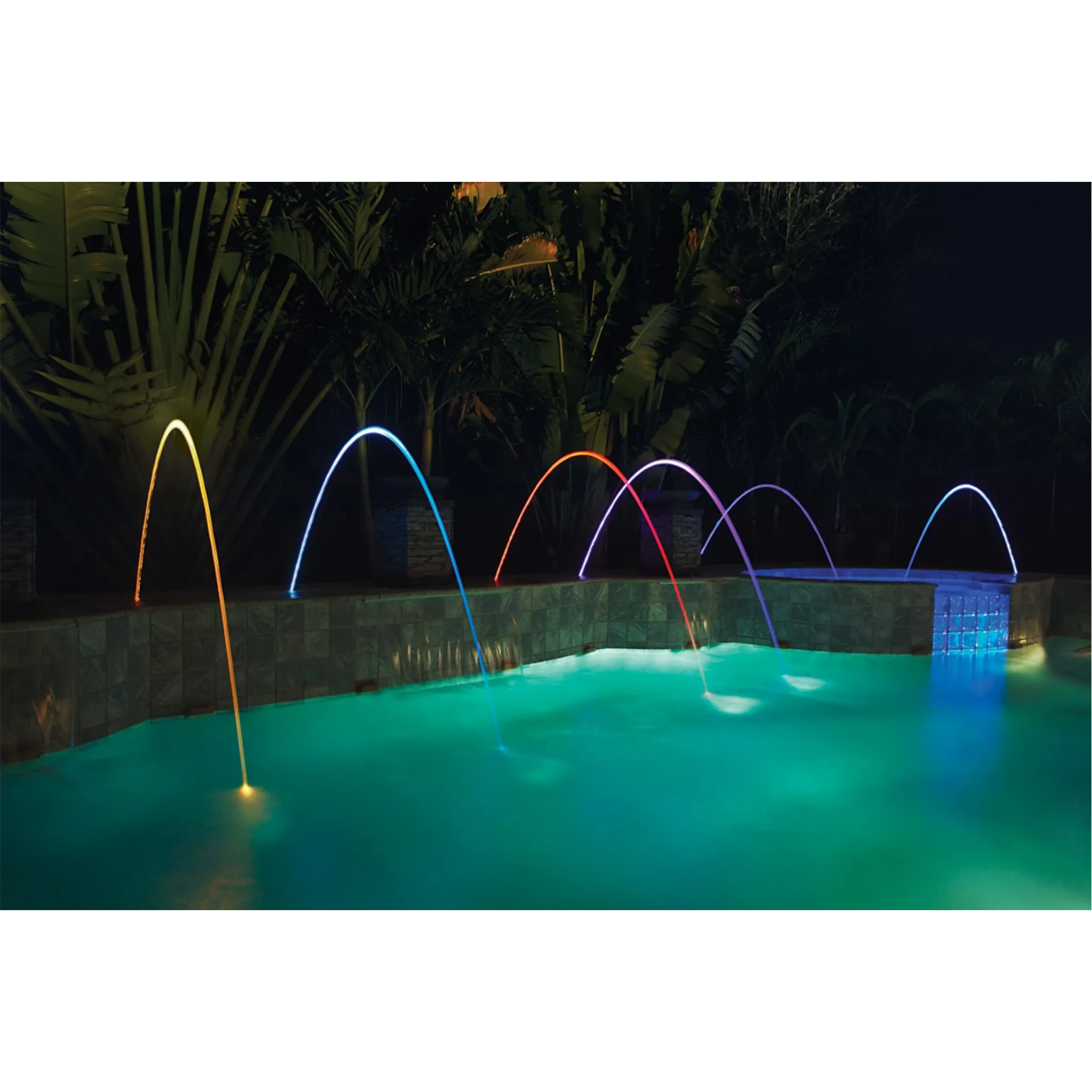 MagicStream laminars create totally clear, uniform arcs of moving water that originate from either your pool deck or surrounding landscape. At night, these translucent streams are brilliantly colored with an LED light source. The result is a water effect that adds an elegant bit of entertainment to your poolscape.